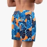 Stijlvolle heren zwemshort met blauw palmboompatroon, elastische tailleband en trekkoord. Perfecte zwembroek voor strandvakanties en zomerse activiteiten.